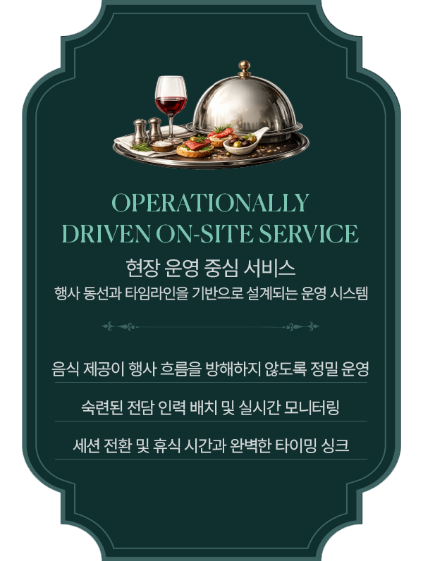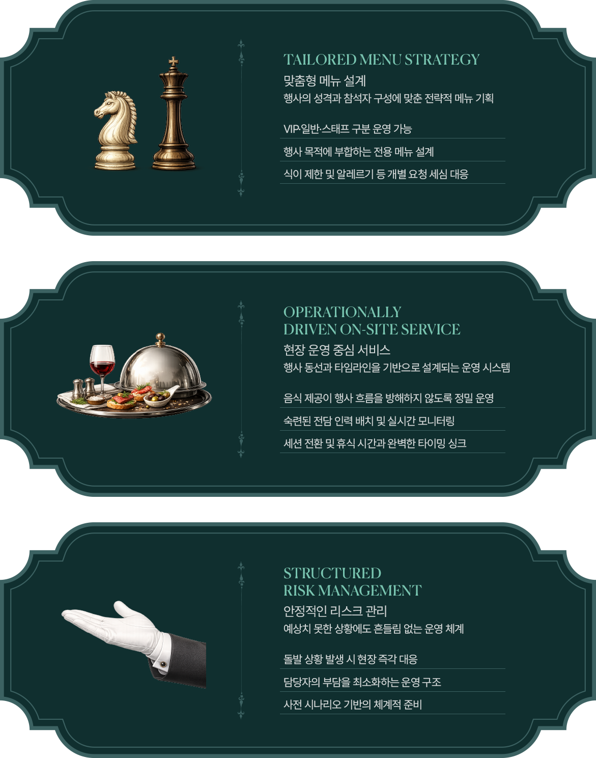 단순한 케이터링을 넘어, 행사의 품격과 성공을 책임지는 파트너가 되겠습니다.